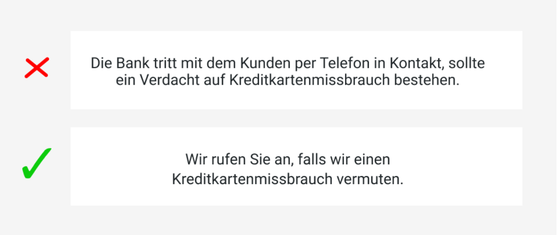 In erster und zweiter Person schreiben (Du/ Ihr/ Sie): Die direkte Absprache ist menschlicher als wenn du von deinem Produkt oder deinem Kunden in der dritten Person sprichst. "Die Bank" wird zu "Wir", "Der Kunde" wird zu "Sie".